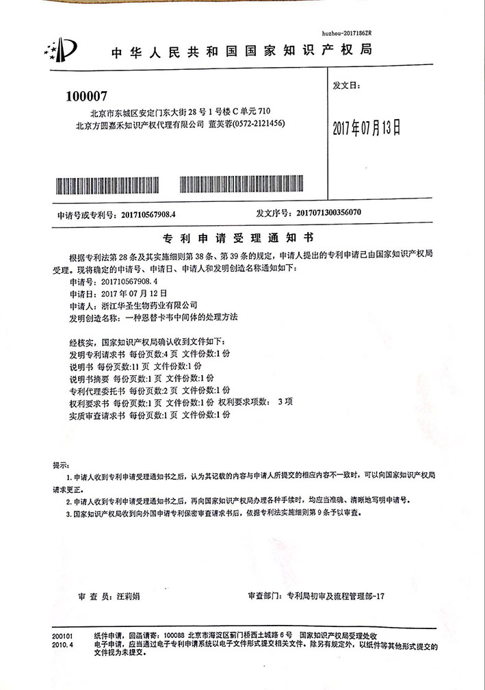 喜報:恭喜浙江愛諾生物藥業股份有限公司獲得專利:“一種恩替卡韋中間體的處理方法”,在此特向一直以來關心支持本企業的各位領導,各位朋友衷心表示感謝