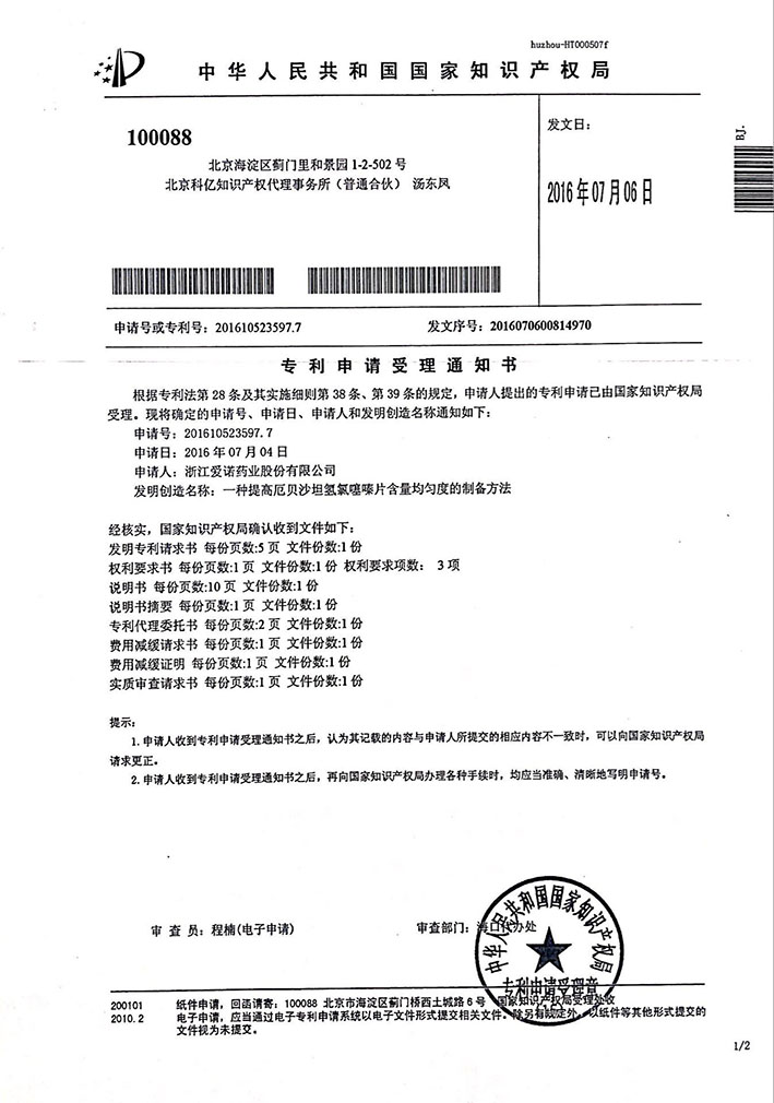 喜報:恭喜浙江愛諾生物藥業股份有限公司獲得專利:“一種提高厄貝沙坦氫氯噻嗪片含量均勻度的制備方法”,在此特向一直以來關心支持本企業的各位領導,各位朋友衷心表示感謝