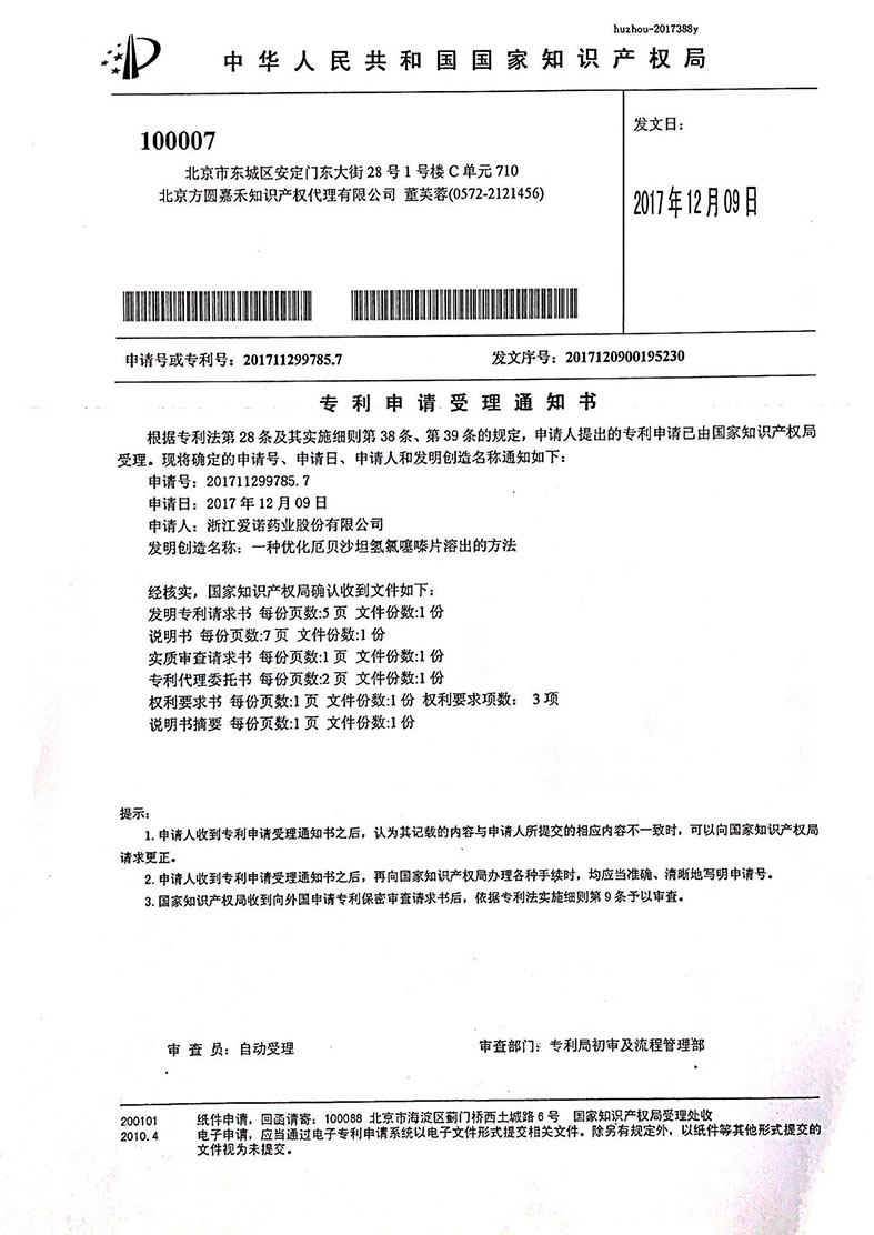 喜報:恭喜浙江愛諾生物藥業股份有限公司獲得專利:“一種優化厄貝沙坦氫氯噻嗪片溶出的方法”,在此特向一直以來關心支持本企業的各位領導,各位朋友衷心表示感謝!