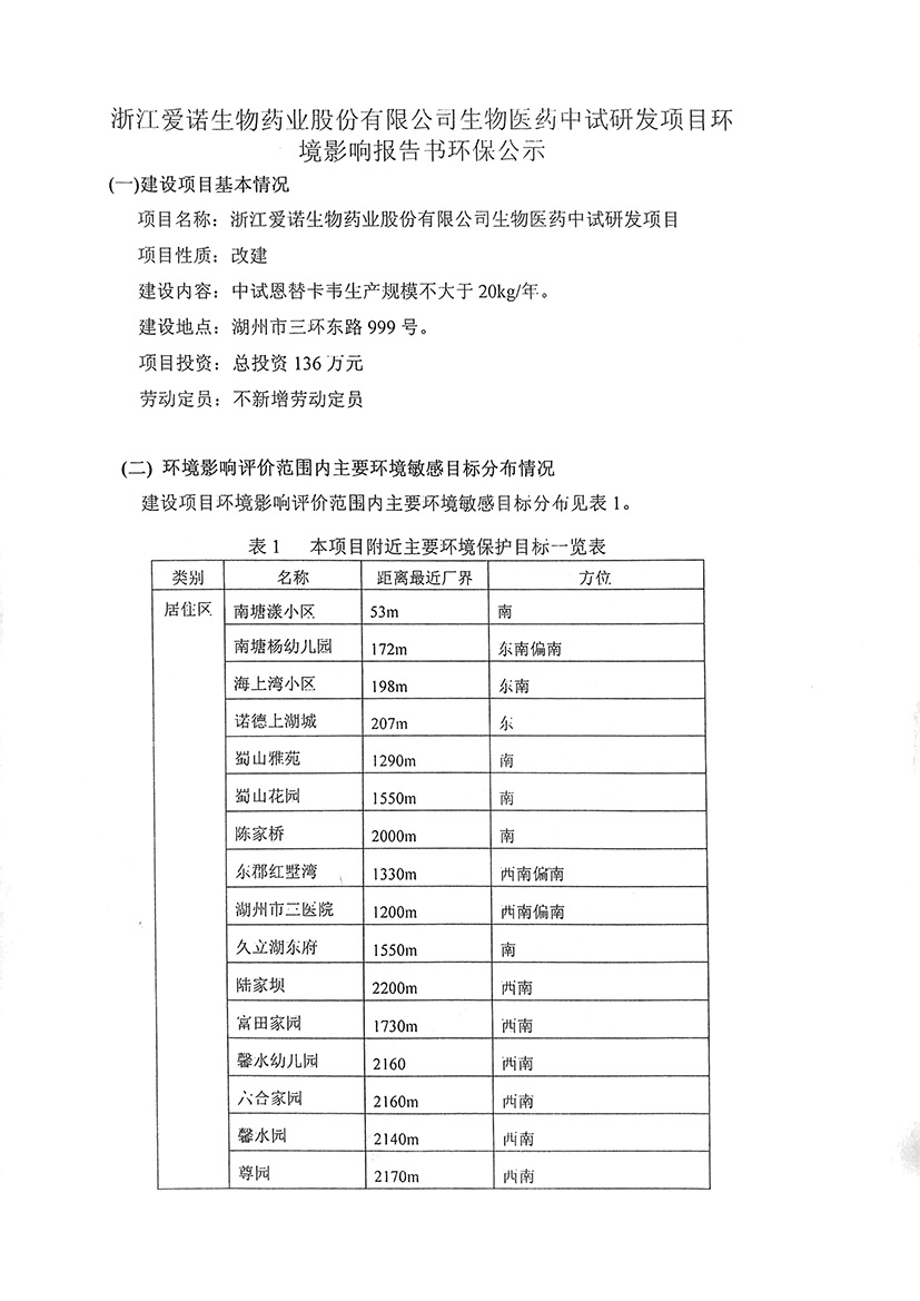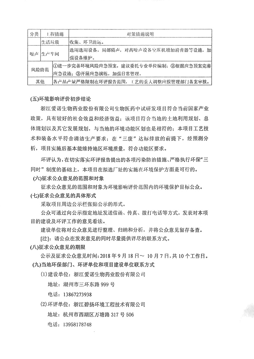 浙江愛諾生物藥業(yè)股份有限公司生物醫(yī)藥中試研發(fā)項(xiàng)目環(huán)境影響報(bào)告書環(huán)保公示