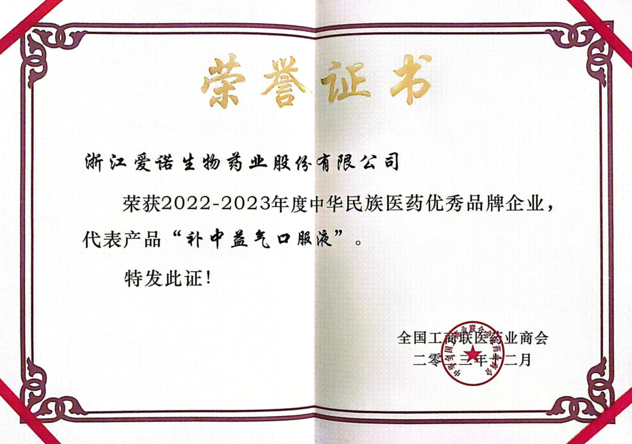 “2022-2023年度中華民族醫(yī)藥優(yōu)秀品牌企業(yè)”